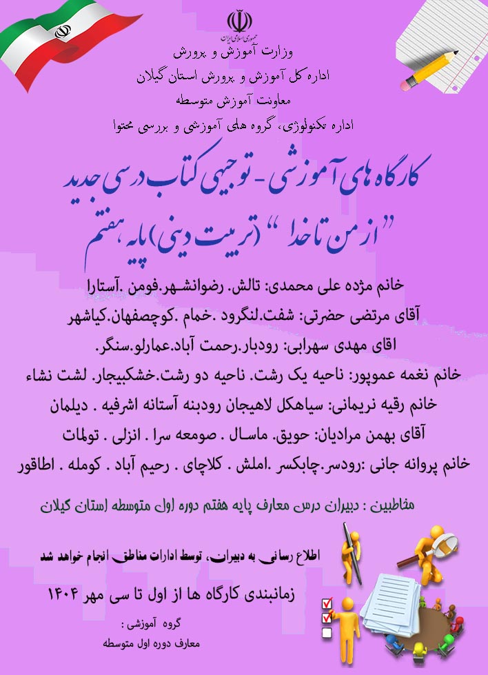 مخاطبین : دبیران درس معارف پایه هفتم دوره اول متوسطه استان گیلان زمانبندی کارگاه ها از اول تا سی مهر 1404